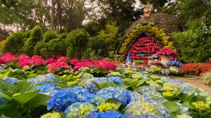 初夏時分繡球花綻放,與玻璃花屋及各種不同主題的花造景相襯相映,彷彿走入童話世界一般夢幻~